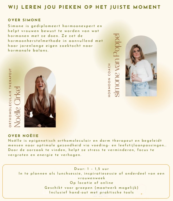 Maar dat is niet alles. Ik wil ervoor zorgen dat de kennis volledig aansluit bij jullie behoeften. Of je nu als team samen beter wilt leren hoe hormonen invloed hebben op jullie werk of als werkgever meer inzicht wilt krijgen in connectie tussen uitval (burn-outs) en hormonale gezondheid van jullie medewerkers. Ik denk graag met jullie mee welk traject passend zou kunnen zijn. Organisaties zoals Mooiland, Feminique, Bep Club, Puur&Natuurleefstijl coaching en de HAN gingen jullie al voor. SimoonHormoon verscheen in een publicatie van MKB servicedesk over hormonen op de werkvloer.